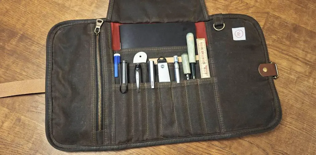 The long vegetable-tanned leather strap is adjustable, so you can pack the roll as full or empty as you like. Because of its compact size, the roll up case fits easily in your bag and takes up minimal space in your workspace.